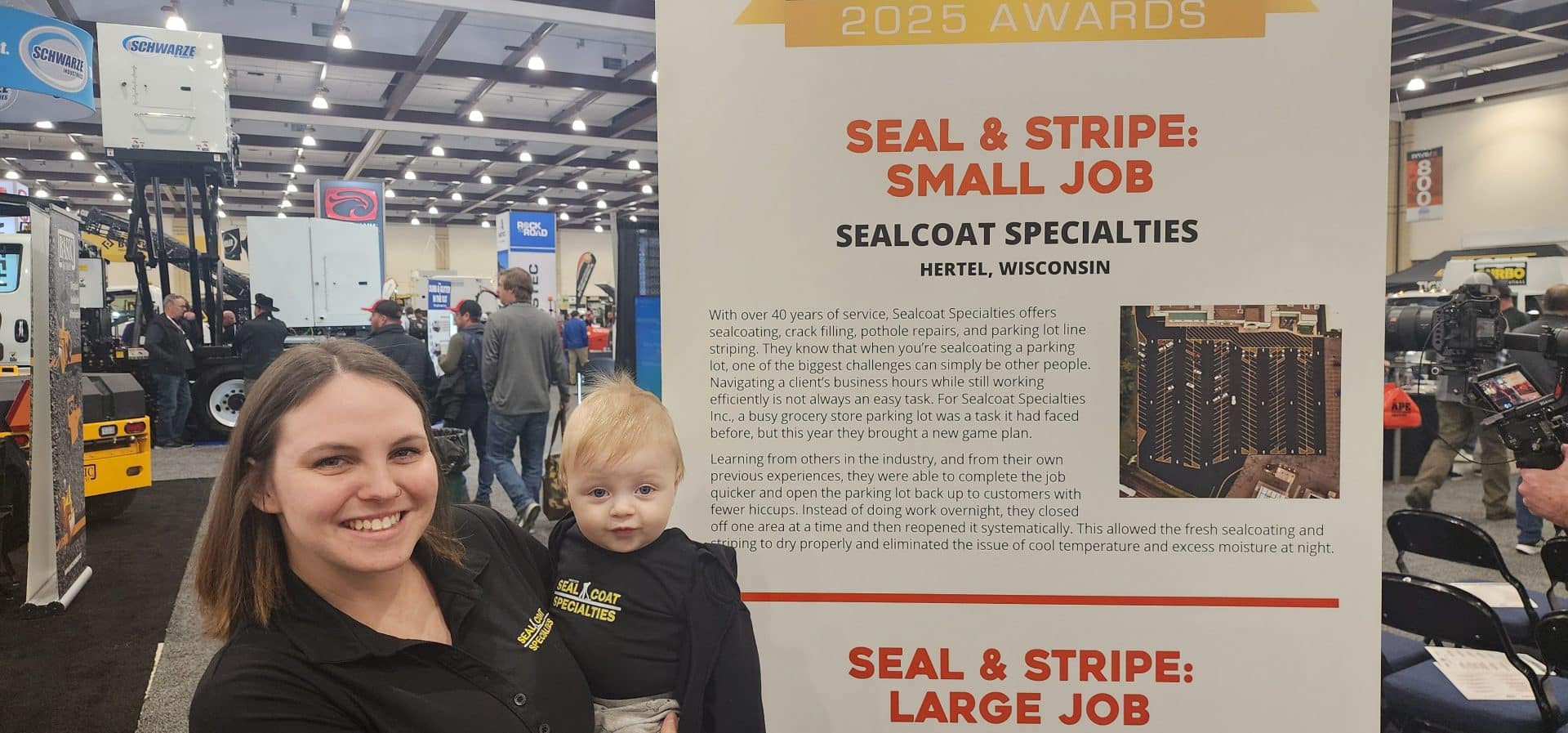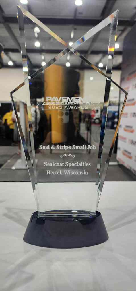 Hertel, Wisconsin – 05Feb2025 – Sealcoat Specialties is honored to announce that we have been awarded the 2025 Seal & Stripe: Small Job Award, presented by Pavement Maintenance & Reconstruction Magazine. The award, which recognizes outstanding performance and innovation in the pavement maintenance industry, was accepted by our team in Chattanooga, Tennessee at the national Pave/X show.